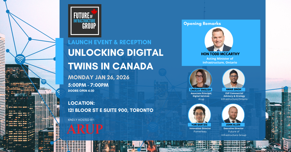 Please join us for the launch of our new Digital Twin report in Toronto on January 26. We are fortunate to be joined by the Honorable Todd McCarthy, Ontario’s Acting Minister of Infrastructure who will provide remarks on the province’s ambitious infrastructure investments and efforts to drive innovation in the sector.